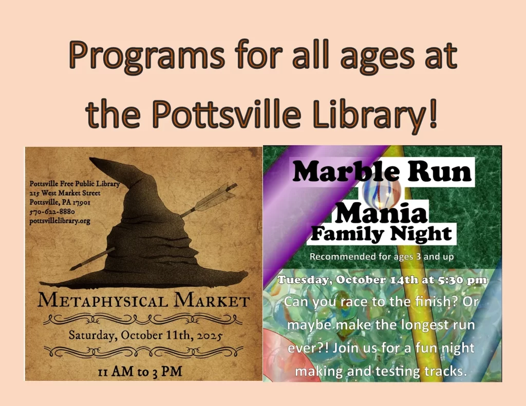 This Saturday, Oct. 11th, is the Metaphysical Market which will run from 11 AM until 3 PM. Visit the Pottsville Free Public Library for a magical day of unique vendor shopping, tarot readings, a used book sale and a delicious lunch spot. The historic Library building will be transformed into a showcase of magic & whimsy!