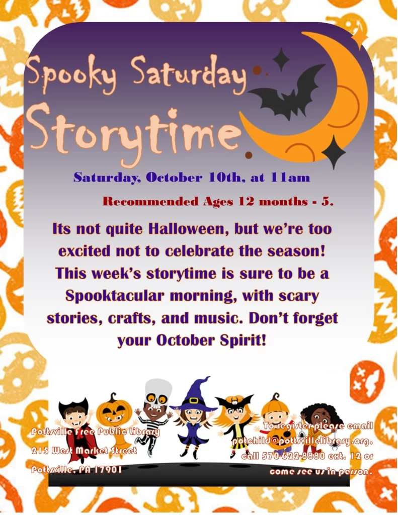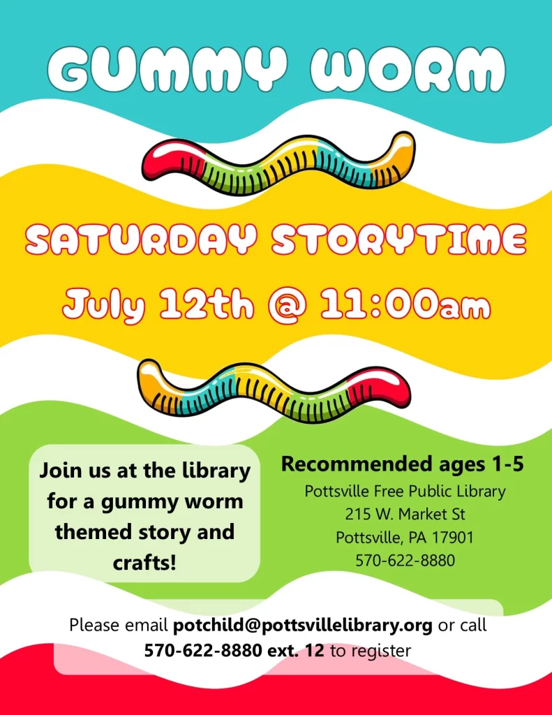 Did you know that, in addition to the regular storytimes during the week, the Pottsville Library has special themed storytimes one Saturday each month? These are great activities for younger children and their caregivers, giving you indoor options when the weather is too hot or wet to enjoy being outside. Join us on July 12 to celebrate National Gummy Worm day. In August we will be taking part in National Tell a Joke Day on the 16th; bring your best jokes and jests! On September 13th we will be having fun with Talk Like a Pirate Day. And the first Saturday of October, 10/4, it will be a Spooky Saturday. Saturday storytimes begin at 11 AM, are appropriate for ages 1-5 and include stories, crafts and games. Siblings and families are always welcome! To register for any of these programs please email the Youth Services Department at potchild@pottsvillelibrary.org, call 570-622-8880 ext. 12, or stop by the Library to talk to the staff. To find out what’s happening in the Youth Services Department or other events at the Library, you can visit our web calendar at www.pottsvillelibrary.org/events/ so you can plan ahead.